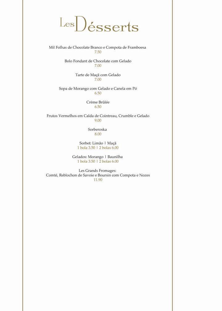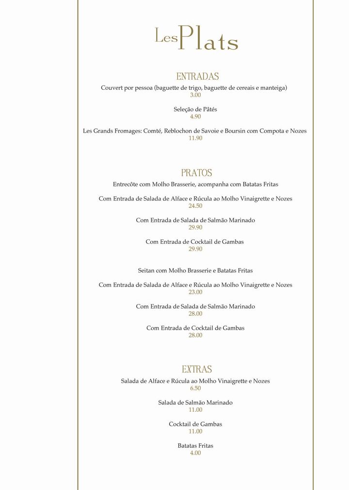 Introducing the menu at La Brasserie de l'Entrecote - 1990-203 Lisboa is a journey into the heart of authentic French dining. Nestled in the vibrant locale of Alameda dos Oceanos, this brasserie specializes in a select array of dishes that resonate with carnivorous delight. Start your gastronomic adventure with an enticing Couvert Baguette, paired harmoniously with an array of Patês and rich cheeses.